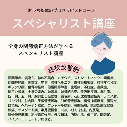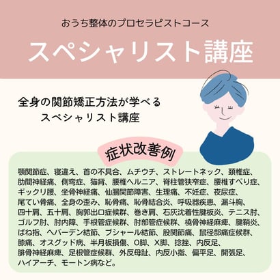 顎関節症、寝違え、首の不具合、ムチウチ、ストレートネック、頚椎症、肋間神経痛、側弯症、猫背、腰椎ヘルニア、脊柱管狭窄症、腰椎すべり症、ギックリ腰、坐骨神経痛、仙腸関節障害、生理痛、不妊症、夜尿症、尾てい骨痛、全身の歪み、恥骨痛、恥骨結合炎、呼吸器疾患、漏斗胸、四十肩、五十肩、胸郭出口症候群、巻き肩、石灰沈着性腱板炎、テニス肘、ゴルフ肘、肘内障、手根管症候群、肘部管症候群、橈骨神経麻痺、腱鞘炎、ばね指、へバーデン結節、ブシャール結節、股関節痛、鼠径部痛症候群、膝痛、オスグッド病、半月板損傷、O脚、X脚、捻挫、内反足、腓骨神経麻痺、足根管症候群、外反母趾、内反小指、偏平足、開張足、ハイアーチ、モートン病など。